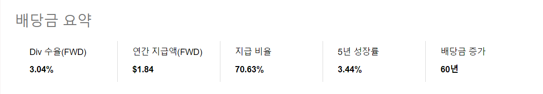 또한 60년 연속 배당금을 증가한 배당킹으로 많은 사람들한테 사랑받고 있는 배당주 중 하나입니다.