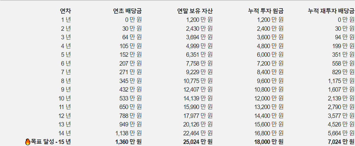 15년 후 총 자산: 2억 5,024만 원, 총 투자 원금: 1억 8,000만 원, 월 배당금: 113만 원으로 나왔습니다.