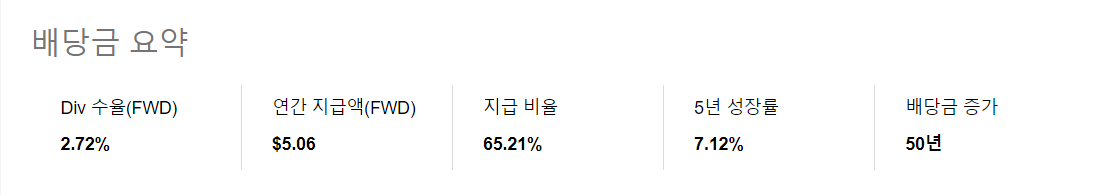 펩시코(PEP)는 Seeking Alpha에 따르면 배당 지급 비율은 65.21%, 5년 성장률은 7.12%, 올해 배당금은 5.06$, 배당 수익률은 2.72%입니다.