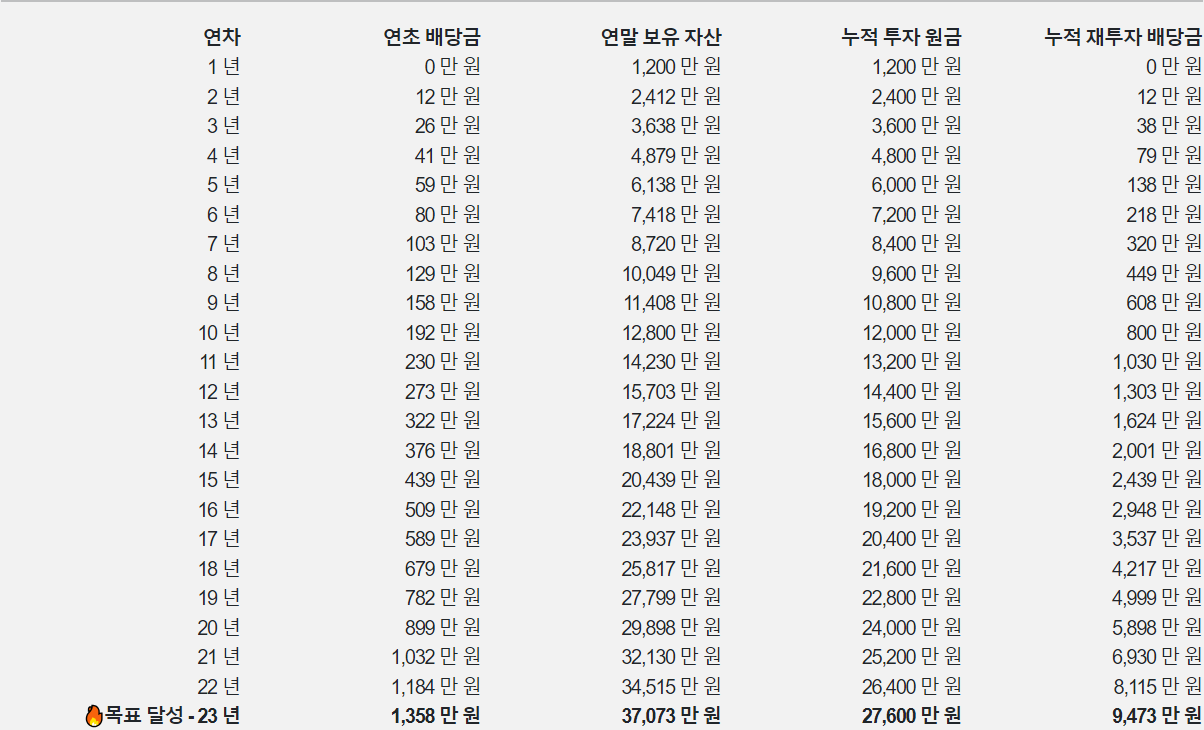 23년 후 총 자산: 3억7,073만원, 총 투자 원금: 2억7,600만원, 월 배당금: 113만원으로 나왔습니다.
