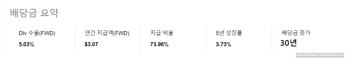 또한 주당 배당금은 3.07$, 배당 수익률은 5.03%로 나와있습니다.