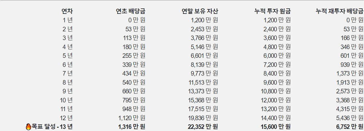 13년 후 총 자산: 2억2,352만원, 총 투자 원금: 1억5,600만원, 월 배당금: 110만원으로 나왔습니다.