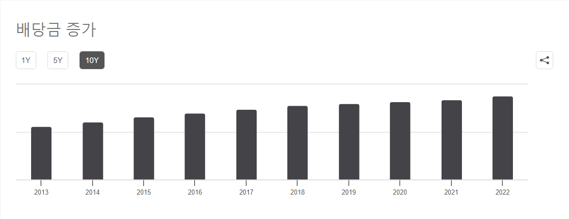 2013년에는 1.12$에서 2023년 1.76$로 약57%의 배당금이 증가 했습니다.