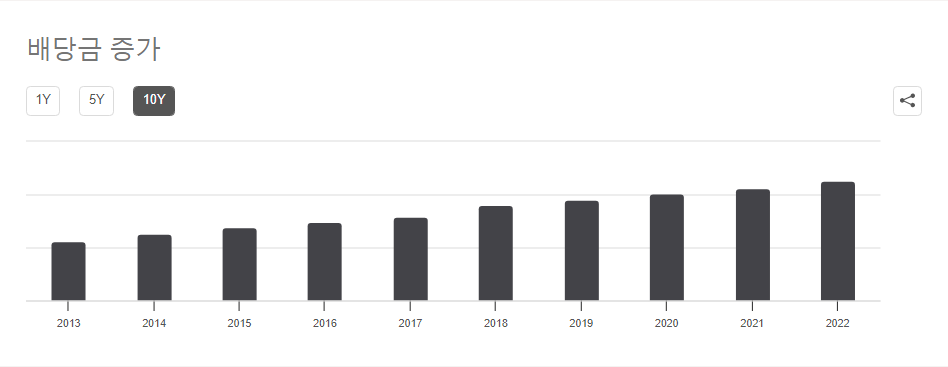 2013년 2.24$에서 2023년 4.52$로 배당금이 약 101%가 증가한 모습을 보여주고 있습니다.
