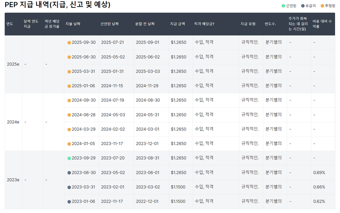 펩시(PEP)는 1,3,6,9월에 배당을 받는 주식입니다.