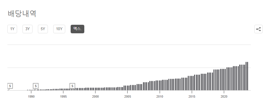 1989년에서 2023년까지 배당금은 0.04$에서 1.27$로 3,075% 증가한 모습을 보여주고 있습니다.