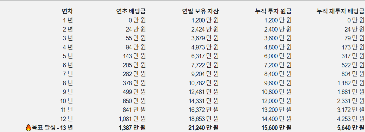 13년 후 총 자산: 2억 1,240만 원, 총 투자 원금: 1억 5,600만 원, 월 배당금: 116만 원이 나왔습니다.