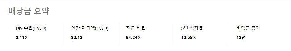 또한 배당 수익률은 2.11%, 주당 배당금은 2.12$입니다.