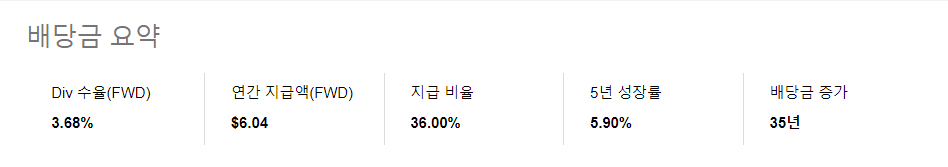 또한 지급 비율은 36%, 5년 성장률 5.90%, 배당금 증가는 35년으로 나와있습니다.
