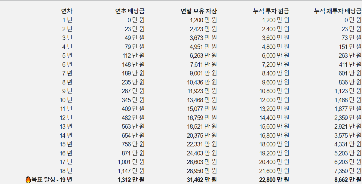 19년 동안 100만 원씩 투자했을 때 약 연간 1200만 원의 배당금을 받을 수 있습니다.