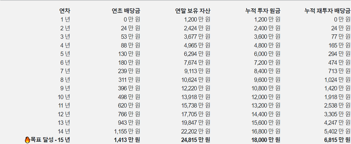 15년 후 총 자산:2억 4,815만 원, 총 투자원금: 1억 8000만 원, 월 배당금: 118만 원이 나왔습니다.