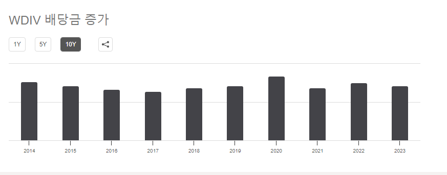 안정적인 배당 수익: S&P Global Dividend Aristocrats Index는 최소 10년 이상 연속으로 배당을 늘려온 기업들로 구성되어 있어, 안정적인 배당 수익을 기대할 수 있습니다. 실제로 WDIV ETF는 연평균 2.5% 이상의 배당 수익률을 제공해 왔습니다.