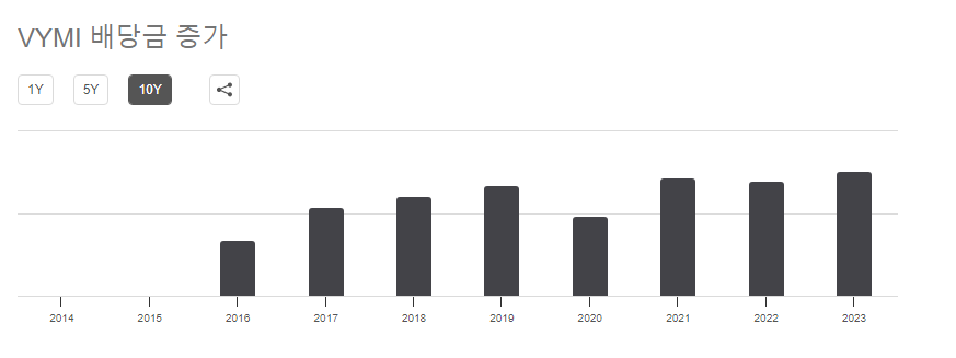낮은 투자 비용: VYMI ETF는 연간 관리 수수료가 0.22%로 , 저렴한 편입니다.