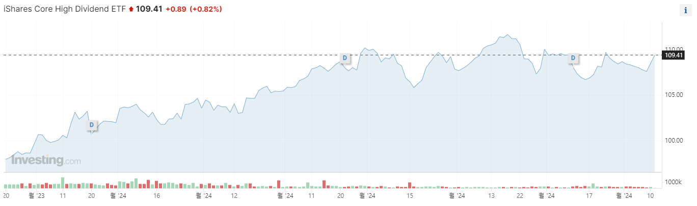 낮은 비용: HDV ETF는 연간 관리 수수료가 0.08%로 매우 저렴한 편입니다. 이는 다른 ETF보다 낮은 수준입니다.