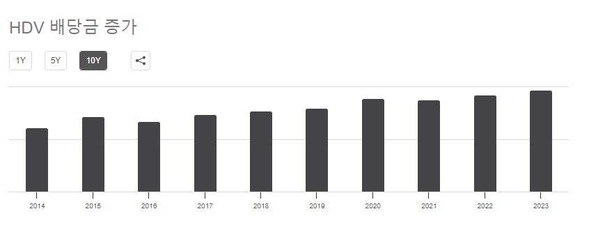 낮은 비용: HDV ETF는 연간 관리 수수료가 0.08%로 매우 저렴한 편입니다. 이는 다른 ETF보다 낮은 수준입니다.