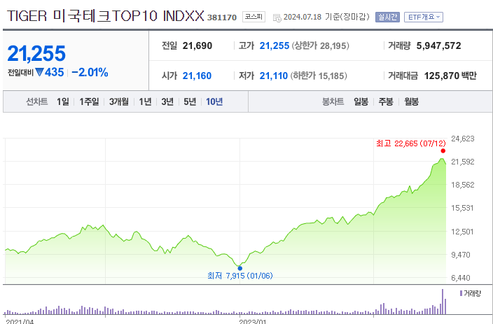 TIGER 미국테크 TOP10 INDXX는 미국 나스닥 시장에서 가장 시가총액이 큰 기술 기업 10개에 투자하는 ETF입니다.