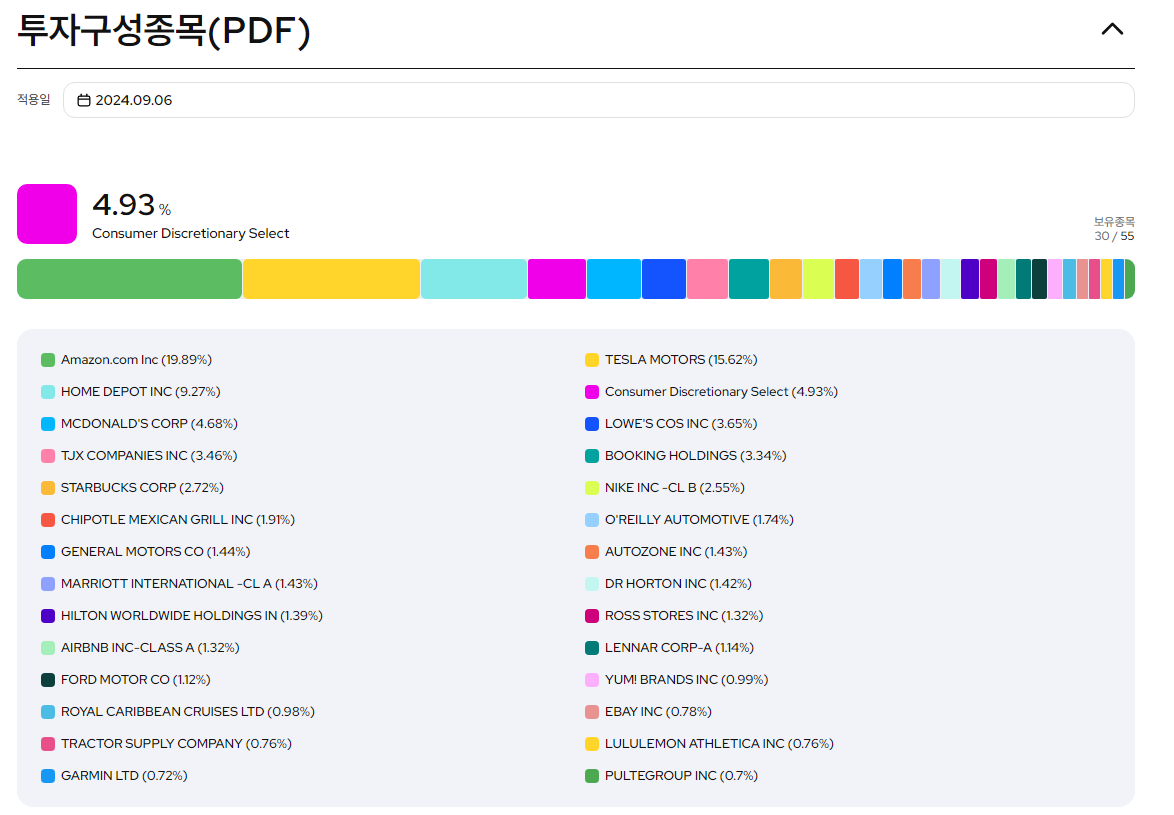 다양한 경기소비재 종목에 분산 투자: ETF 상품은 개별 종목이 아니라 여러 종목에 분산 투자함으로써 리스크를 줄일 수 있습니다. 이를 통해 개별 기업의 성과보다는 전체적인 산업의 성장에 집중할 수 있습니다.
