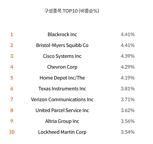 이 ETF는 다우존스 고배당 지수를 기반으로 한 주식들을 포함합니다. 주호 안정적인 배당 지급 이력을 가진 대형 우량주들로 구성되어 있으며, 이를 바탕으로 지속 가능한 배당 수익을 제공합니다. 또한, 콜 옵션 매도로 투가적인 수익을 창출하여 투자자에게 이중 수익 구조를 제공합니다.