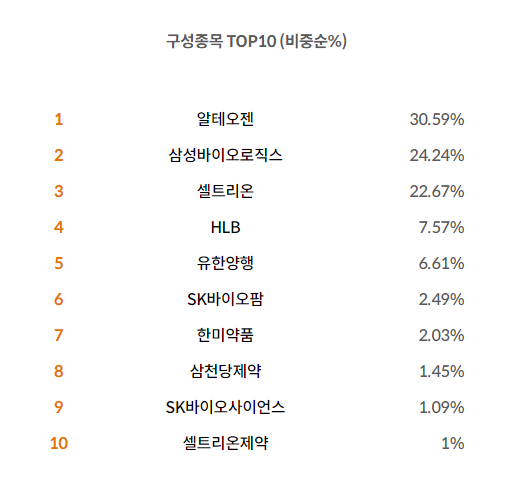 구성 종목: 국내 바이오산업의 대표 기업들로 구성되어 있습니다.