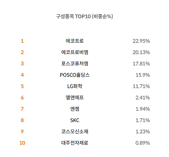 TIGER 2차전지소재Fn(462010) ETF는 주요 전기차 배터리 제조사와 관련 소재 업체들을 포함하고 있습니다. LG화학, 에코프로 등 주요 기업들이 포함되어 있으며, 이들 기업의 성장은 ETF의 가치 상승에 큰 영향을 미칩니다. 특히 이들 기업은 각자의 기술 혁신과 시장 점유율 확대를 통해 전 세계적인 2차 전지 시장에서 중요한 역할을 하고 있습니다.