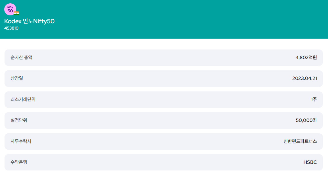 KODEX 인도Nifty50(453810)은 인도의 경제 성장 잠재력을 포착하여 투자자들에게 안정적이고 높은 수익을 제공하는 ETF입니다. 이 ETF는 ㅇ니도 시장의 매력, 경제 개혁 및 정택 지원, 인도 경제와 글로벌 시장의 연계성, 정기적인 분배금 지급, 인도 소비 시장의 성장, 리스크 관리 등 다양한 장점을 가지고 있습니다. KODEX 인도Nifty50은 초보 투자자와 일반 대중에게 이상적인 선택입니다. 이번 포스팅이 KODEX 인도Nifty50에 대한 이해를 높이고, 성공적인 투자 전략을 세우는 데 도움이 되길 바랍니다.