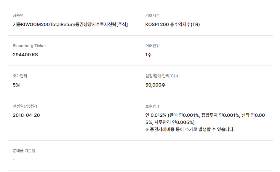 ETF 투자는 일반 펀드보다 낮은 보수율을 가지지만, 운용보수와 스프레드(매수-매도 차이)를 고려하는 것이 중요합니다. KIWOOM 200TR의 운용보수는 상대적으로 낮은 편이지만, 매매 시 유동성을 충분히 고려하는 것이 좋습니다.