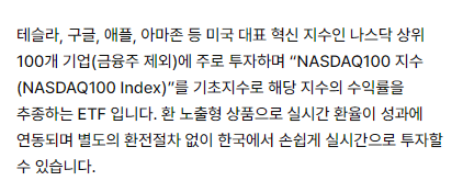 • 🚀 미국 기술주에 간편하게 투자 가능 – 나스닥 100 기업을 한 번에 담을 수 있어 분산 투자 효과를 누릴 수 있습니다.