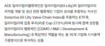 ACE 일라이릴리 밸류체인 ETF는 **일라이릴리와 관련된 헬스케어 기업들의 주가 흐름을 추종하는 패시브 ETF**입니다.