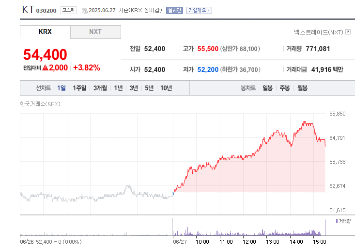 KT(030200)는 코스피 시장에 상장되어 있으며, 대형 통신주로서 국내 투자자들의 관심을 꾸준히 받고 있습니다.